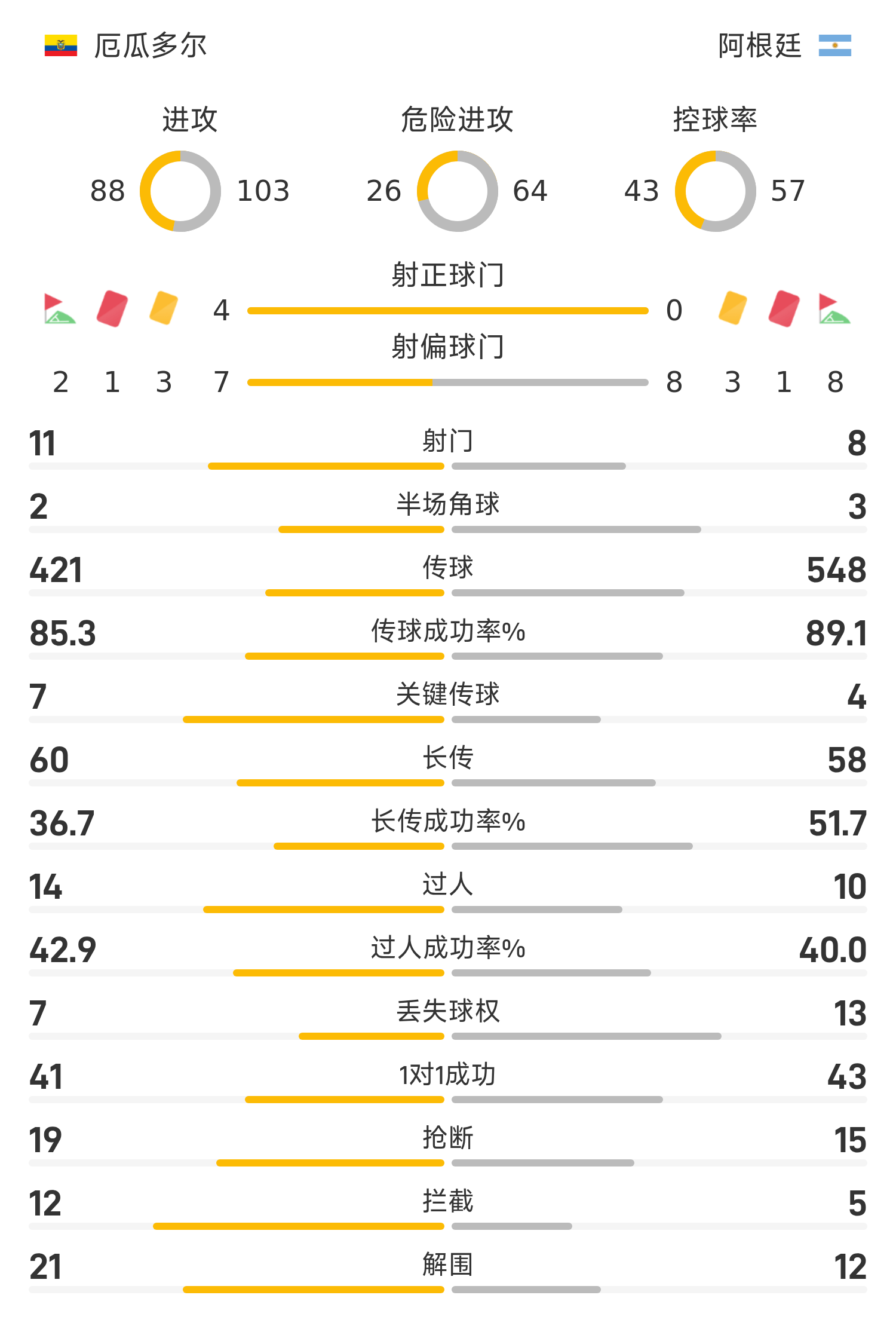 厄瓜多尔首发阵容:1-加林德斯、21-弗兰科、6-帕乔、3-因卡皮耶、4-奥多涅斯、17-普雷西亚多(46’9-叶博亚)、19-普拉塔(69’11-罗德里格斯)、23-凯塞多、15-维特、20-安戈洛(59’18-阿尔西瓦)、13-瓦伦西亚(59’10-派兹)